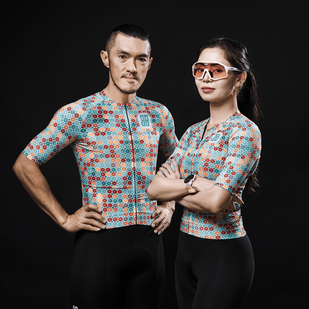 Meet Suka and Cita. Two colours, one heartbeat. A celebration of our region's vibrant soul, brought to life with a symmetric print and an asymmetric twist that gives both designs their own distinct character. Green brings the warmth of our land; blue carries the calm of our skies. Together, they embody sukacita — pure joy you can wear on every ride.